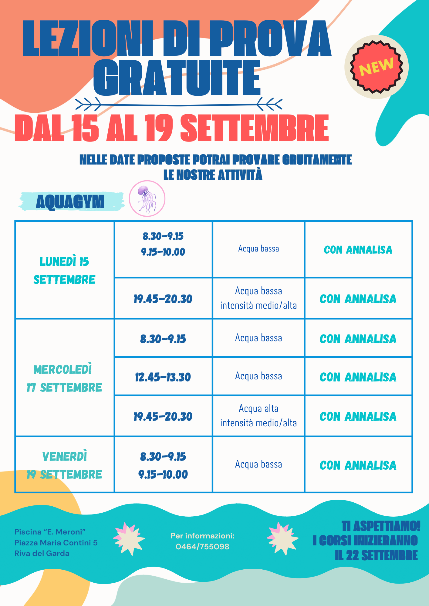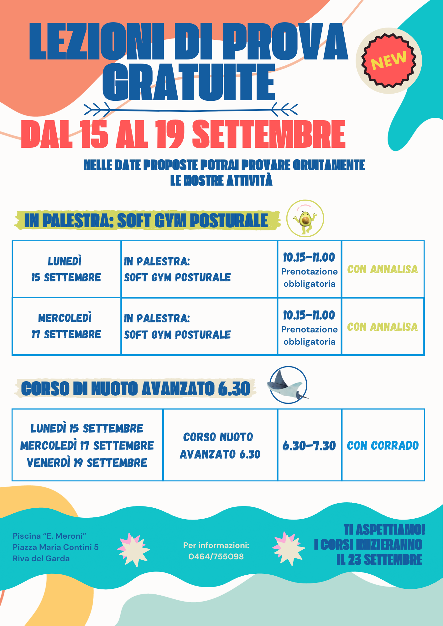 Vieni a provare gratuitamente i nostri corsi: Aquagym, Nuoto avanzato 6.30 e Ginnastica posturale in palestra 😀