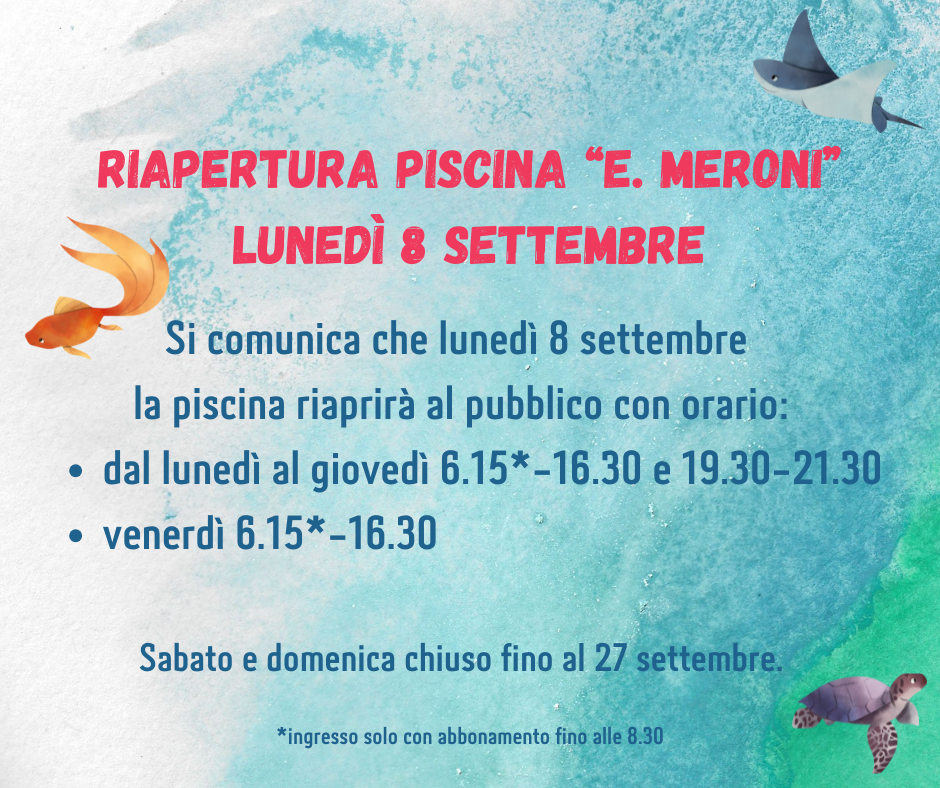 Ricordiamo alla gentile utenza che lunedì 2 giugno, Festa della Repubblica, la piscina comunale “E. Meroni” rimarrà chiusa.